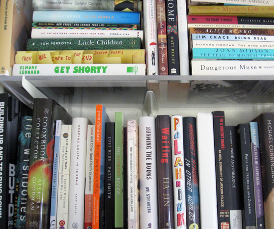 On the first red bookshelf I found PRIDE AND PREJUDICE by Jane Austin and PRIDE AND PREJUDICE AND ZOMBIES by Seth Grahame-Smith. Pluck pluck, my pile started. I added BRINGING OUT THE DEAD by Joe Connelly and SPARTINA by John Casey. OLIVE KITTERIDGE by Elizabeth Strout and A GATE AT THE STAIRS by Lorrie Moore. I love my job! TELL-ALL by Chuck Palahniuk, LAY THE FAVORITE by Beth Raymer, ROBOPOCALYPSE by Daniel H. Wilson, Claire Messud's THE EMPEROR'S CHILDREN - these were hard cover first editions! Kate Christensen and Jonathan Tropper were piled on Tim O'Brien who was sitting on SUNDAY SUPPERS AT LUCQUES by Suzane Goin.