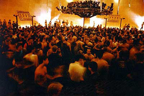 We entered the Saint and walked passed what looked like standard ticket windows for a theater or concert hall. We then went through a large set of doors to the dance floor. Disco was pounding, but it wasn't like anything I had heard on the radio. Nor was the dance floor like anything I had ever seen: it was huge, bigger than a skating rink, and it was covered by a massive dome. In the center of the dome was a pole that held a sci-fi looking contraption filled with lights and it slowly moved up and down projecting stars and swirls and blasts of color onto the top of the dome. Hundreds of men, mostly shirtless, many in leather, danced packed in.